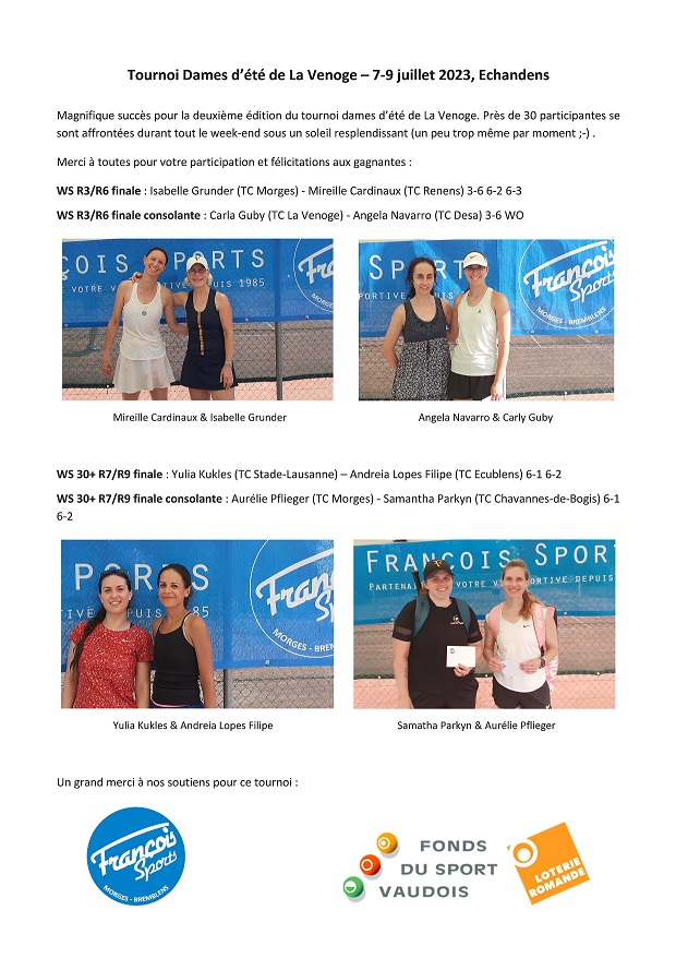 Beau succès pour la première édition du tournoi dames d’été organisé par le TC La Venoge. 23 participantes se sont affrontées durant tout le week-end dans 3 catégories différentes sous un soleil resplendissant. Un grand merci à François Sports à Morges/Bremblens pour avoir offert de nombreux prix aux participantes.